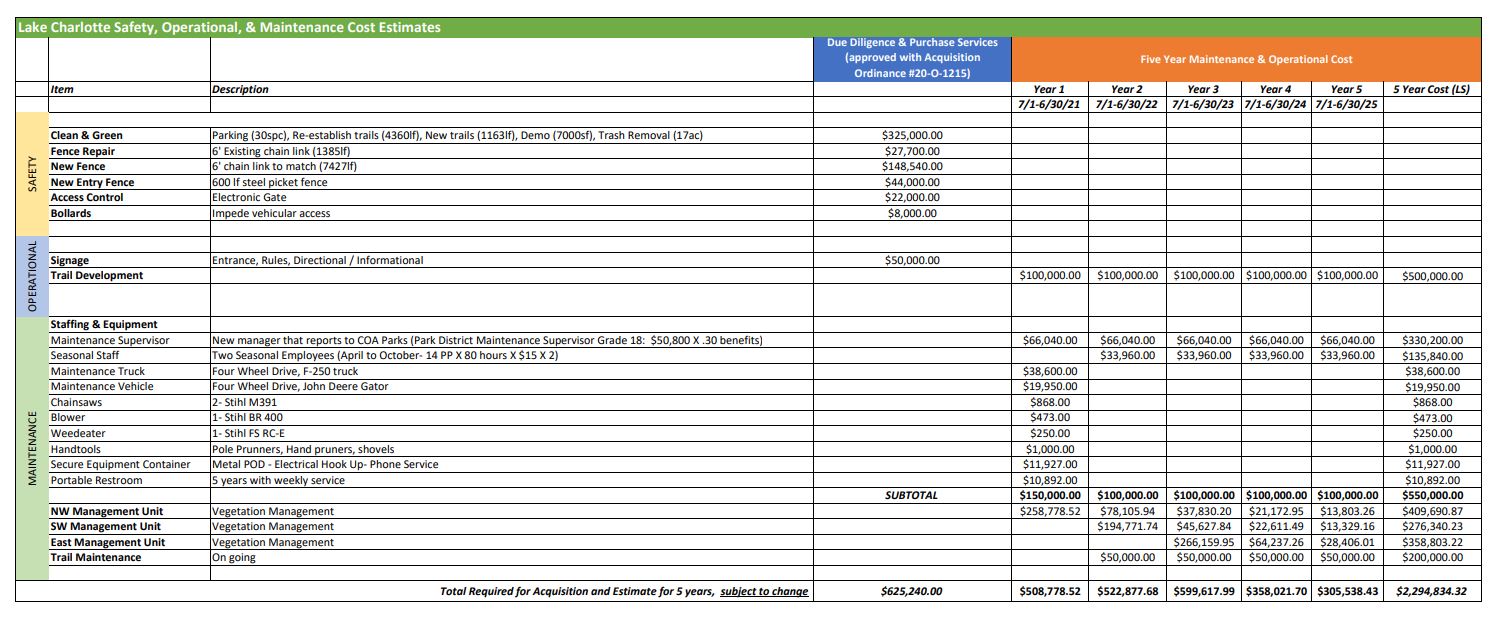 The maintenance ordinance that was sent back to the CD/HS Committee proposes nearly $2.3 million for maintenance of Lake Charlotte to be paid over five years, including such expenses as: