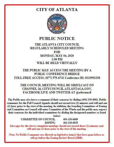 Please contact all the City Council representatives before the Full City Council votes THIS MONDAY, May 4 at 1 pm to tell them to not approve this maintenance ordinance as it is currently written and to send it back to the CD/HS Committee to get the full review it should have gotten in last Tuesday's meeting. In addition to emailing and calling your City Council members individually, please call 404-330-6001 by 12 noon on Monday, May 4, to leave a voicemail that will be played during the public comments section of the City Council meeting.